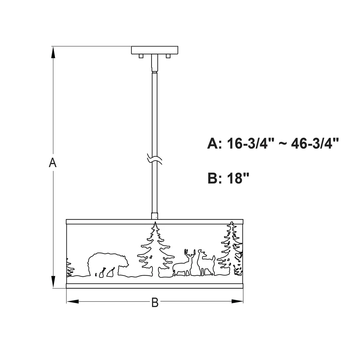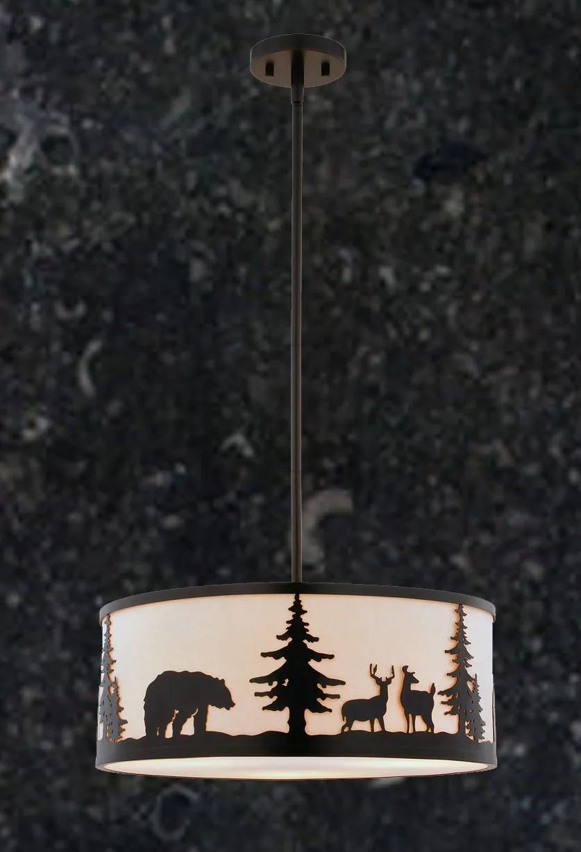 Embrace the serene whispers of the artfully crafted pendant to bring the essence of the wild into your home. The pendant's three lights and textured linen shade showcase bear and deer silhouettes set against a backdrop of evergreen trees. Perfect for kitchens or family rooms of cabins, lodges, or any home seeking to add a touch of nature and rustic ambiance.