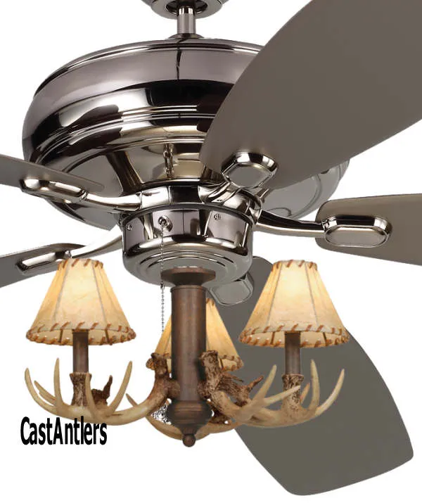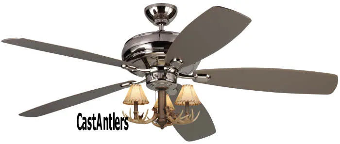 Fan includes antler light kit w/ Polished Nickel finish, shades and 4" downrod. Fan has Polished Nickel Finish with a silver Blade finish. Antler light kit uses 3 x 60W LED equivalant Candelabra bulbs and has a weathered patina finish.