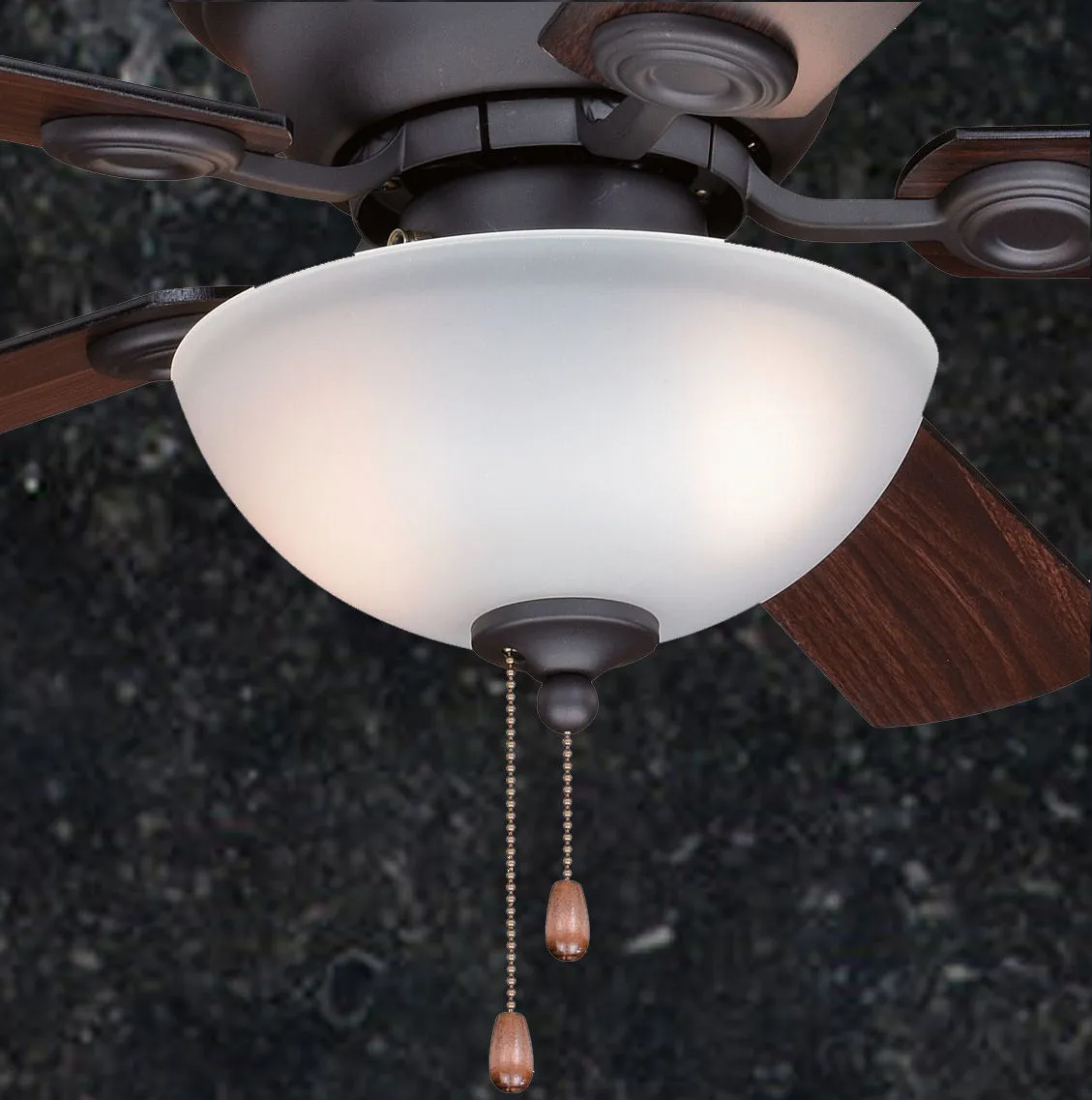 Fan is flushmounted as pictured. Noble Bronze Finish with Dark bronze- driftwood Blade finish. Glass is etched white. Light kit uses 2 transitional CFL bulbs (included).