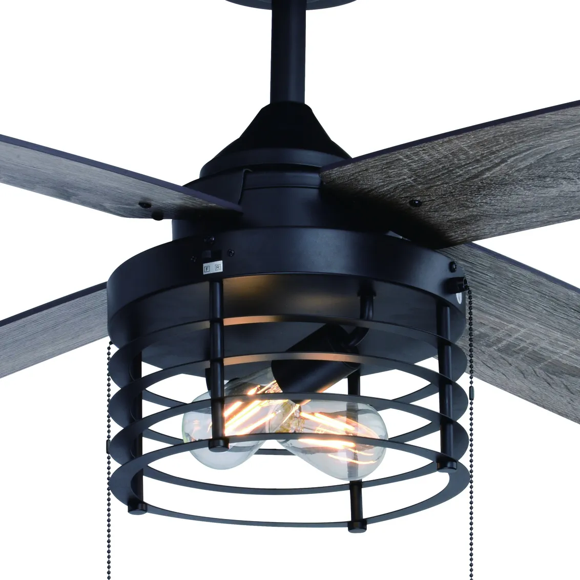 Industrial style is highlighted with the black finish and woven rod drum cage of the 52-in. Industrial/Mondern ceiling fan. Four reversible blades in black walnut or driftwood offer a customized look which delivers comfort and warmth to your home’s family room, bedroom, dining room or kitchen. Perfect for adding an industrial edge to your transitional decor.
