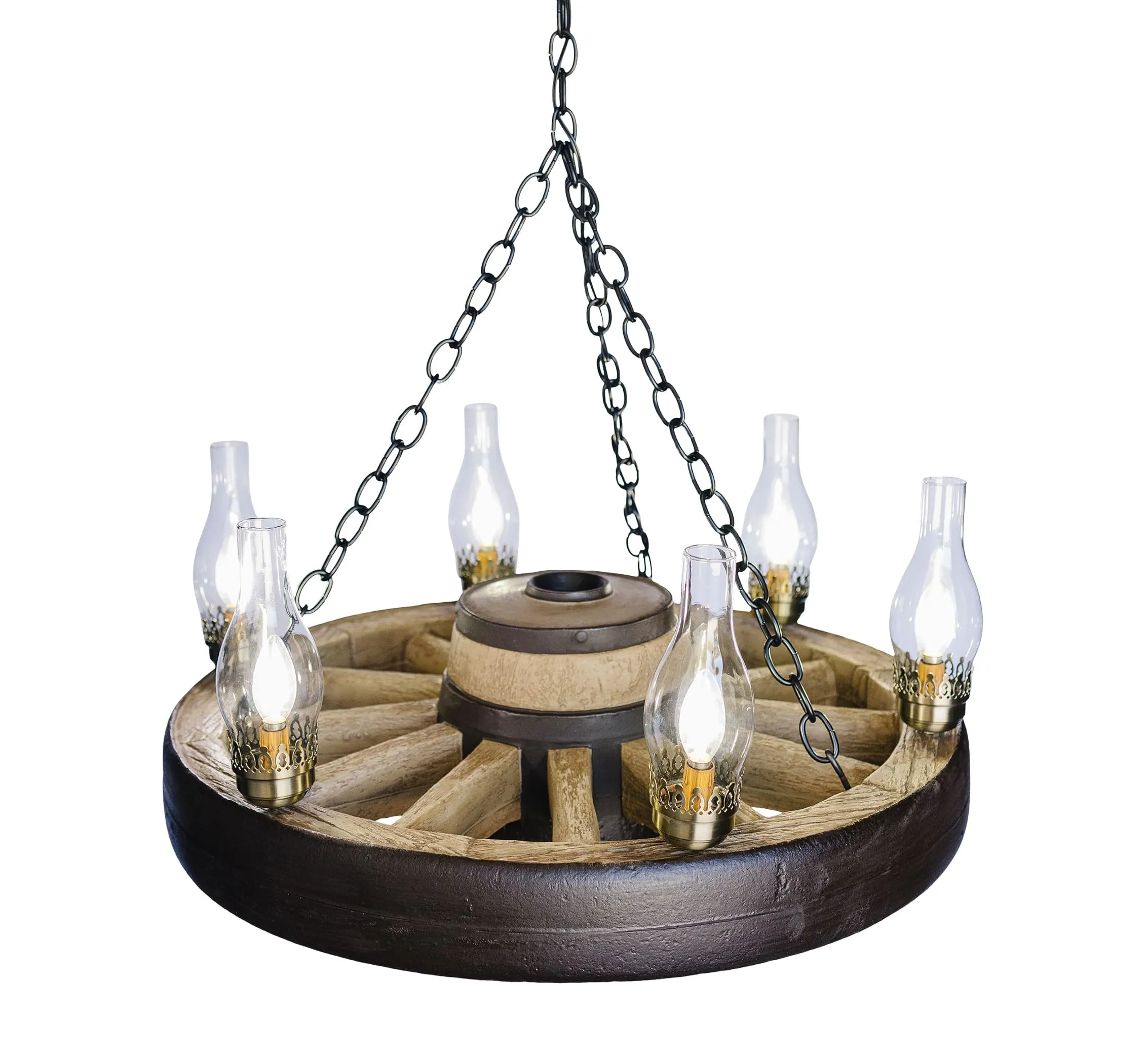 Western Rustic made in the USA. Perfect size for most dining room tables. Measures 30" wide with a large center hub that is 12" tall, weighs 25 lbs. Chandelier has 6 lantern lights. All wiring is internal. Entire fixture UL listed/approved. They require six 25-watt or 40 watt candle bulbs. Comes with enough chain to hang chandelier up to 5' from the ceiling. Ceiling plate and mounting hardware included. Why buy a reproduction wagon wheel?