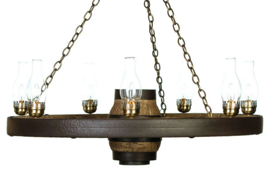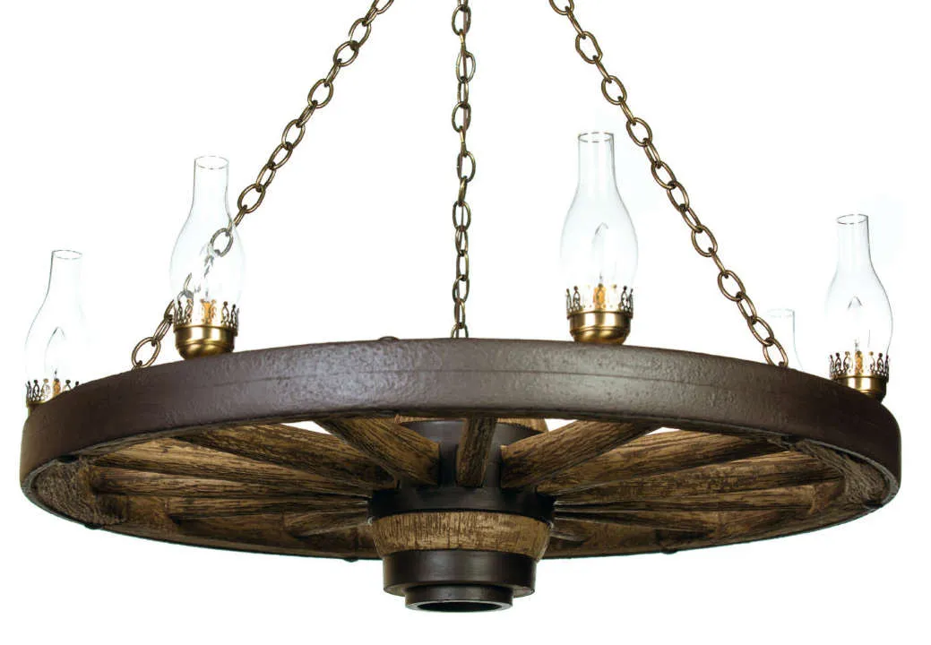Large rustic western, Made in the USA, measures 42" wide with a large center hub that is 12" tall, weighs 25 lbs. Chandelier has 7 lantern lights. All wiring is internal. Entire fixture UL listed/approved. They require seven 25-watt or 40 watt candle bulbs. Comes with enough chain to hang chandelier up to 5' from the ceiling. Ceiling plate and mounting hardware included. Why buy a reproduction wagon wheel?