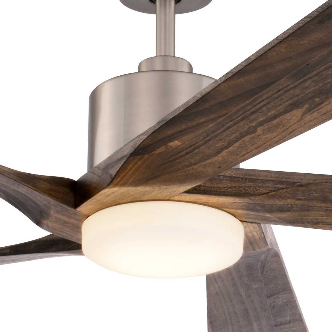 The Wedgewood 60-inch LED ceiling fan combines a refined satin nickel finish with rich natural walnut solid wood blades for a sophisticated, high end look. Perfect for mid-century modern and contemporary interiors, the deeper wood tone adds warmth and contrast, making it an ideal statement piece for living rooms, bedrooms, or open concept spaces. A whisper quiet, energy efficient DC motor delivers powerful airflow with six speeds and reversible operation for year round comfort. The integrated, dimmable LED light offers five selectable color temperatures, allowing homeowners to easily shift from soft ambient lighting to bright task illumination. Damp rated construction ensures dependable performance indoors.