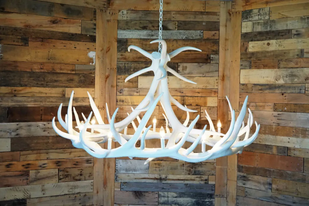 Large, Made in the USA, measures 60" wide and 32" tall, weighs just 28 lbs. Chandelier has 12 candle lights. All wiring is internal. Entire fixture UL listed/approved. Each antler is a professionally handcrafted reproduction. Made from medium-density polyethylene that is light weight but as durable as the real thing, each antler is individually hand-stained and rubbed to look 100% authentic. They require Twelve 25-watt candle bulbs. Chandeliers come standard with 3' of heavy duty chain, multiple colors available. Ceiling plate and mounting hardware included.