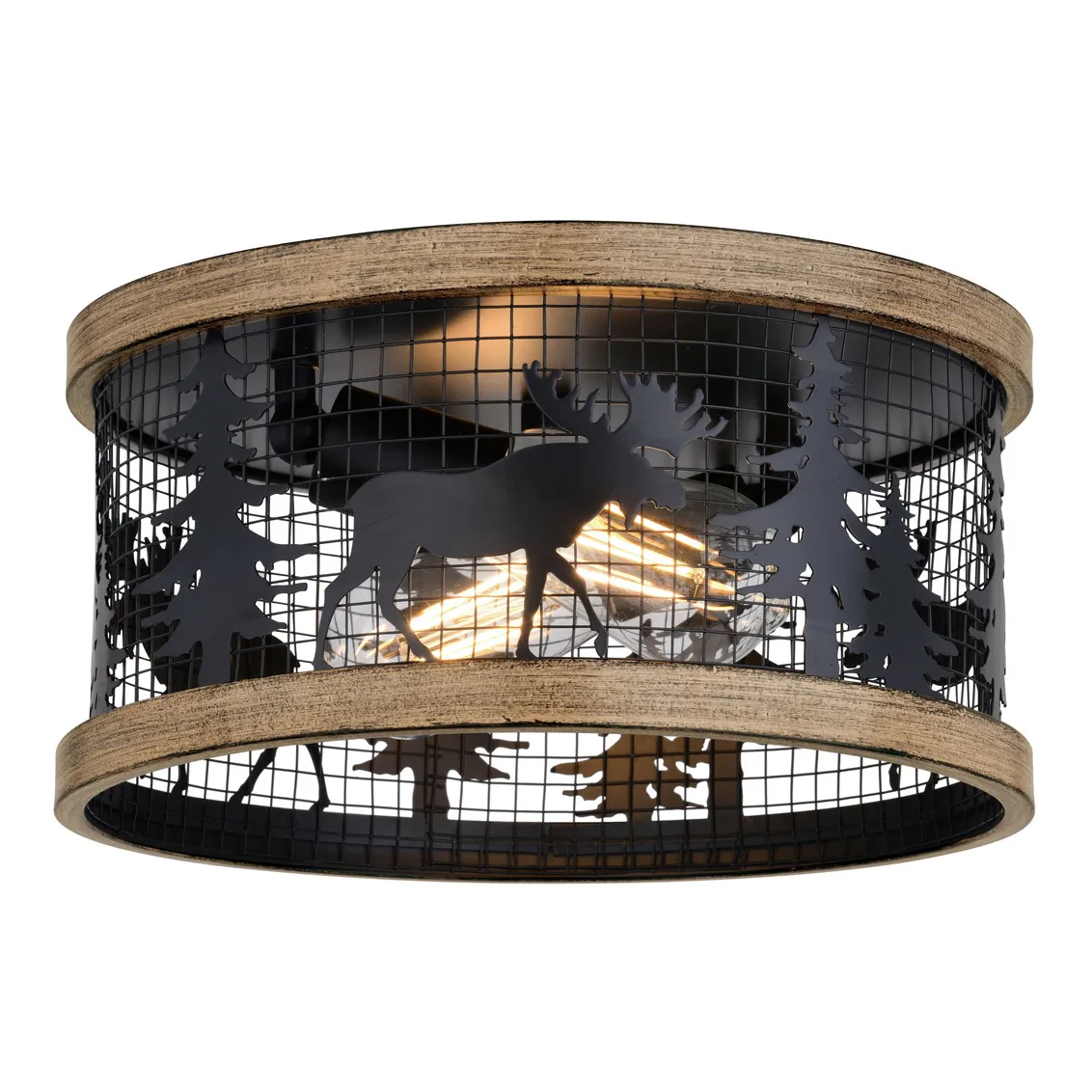 Drum style ceiling light. The pairing of the black and burnished teak finish enhances the on-trend metal cage perfectly. Capture your love of nature with pine tree and moose silhouettes. It is an excellent choice for a vacation lodge, cabin or suburban home and complements a variety of home styles: anywhere you want to bring an element of nature. Rated for damp locations, it can be used in any bathroom, family room, or any other area of your home.