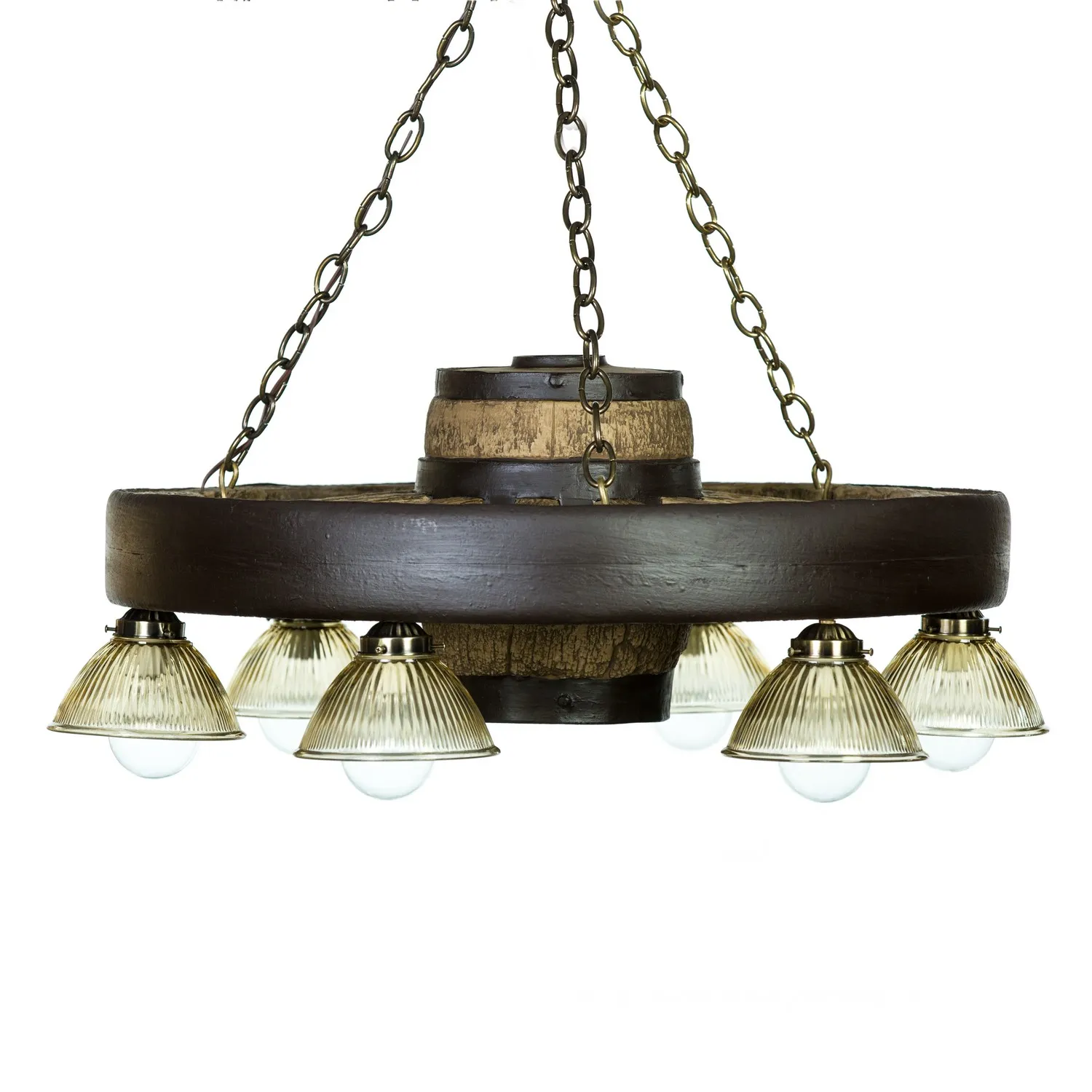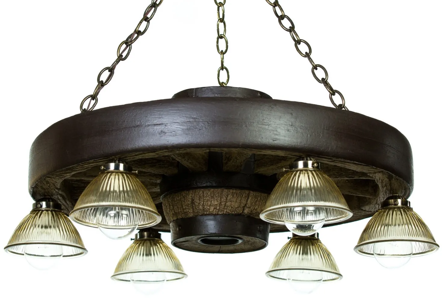 Verde Reproduction Wagon Wheel Chandleier is made in the USA. Perfect size for most dining room tables. Measures 30" wide with a large center hub that is 12" tall, weighs 25 lbs. Chandelier has 6 downlights. All wiring is internal. Entire fixture UL listed/approved. They require six 60-watt bulbs. Comes with enough chain to hang chandelier up to 5' from the ceiling. Ceiling plate and mounting hardware included. Why buy a reproduction wagon wheel?