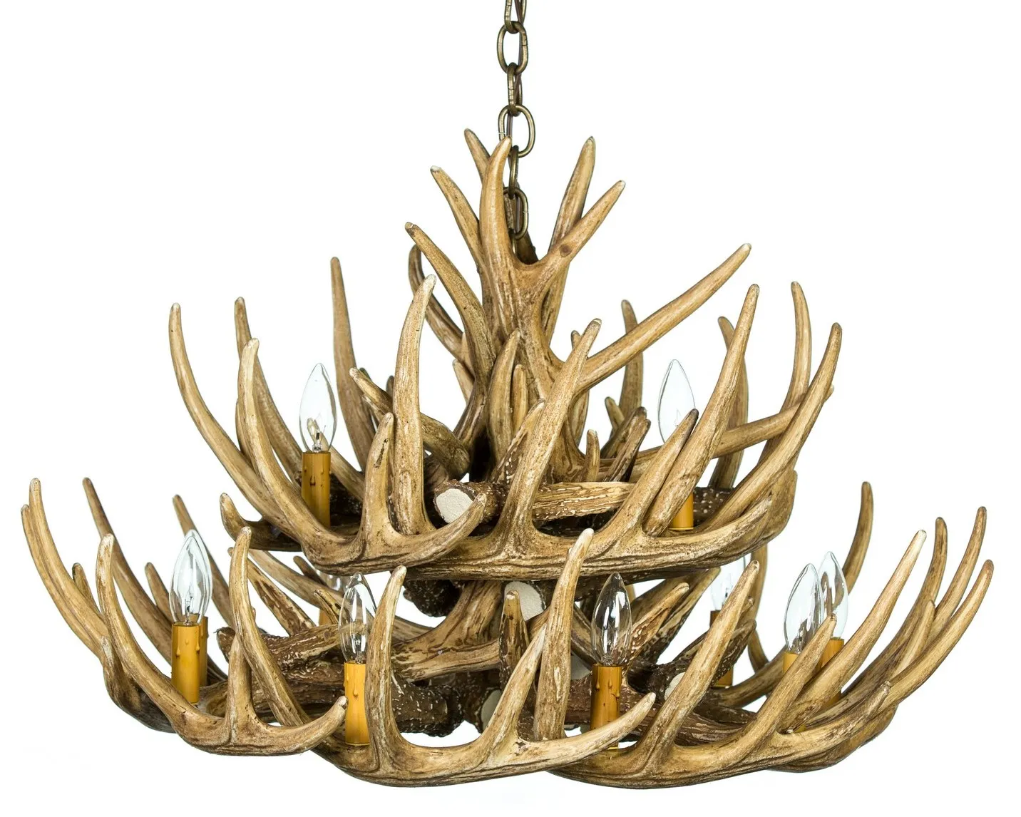 Made in the USA, measures 32" wide and 20" tall. Chandelier has 12 candle lights. All wiring is internal. Entire fixture UL listed/approved. Each antler is a professionally handcrafted reproduction. Made from medium-density polyethylene that is light weight but as durable as the real thing, each antler is individually hand-stained and rubbed to look 100% authentic. They require twelve 25-watt candle bulbs. Chandeliers come standard with 3' of heavy duty chain, multiple colors available. Ceiling plate and mounting hardware included.
