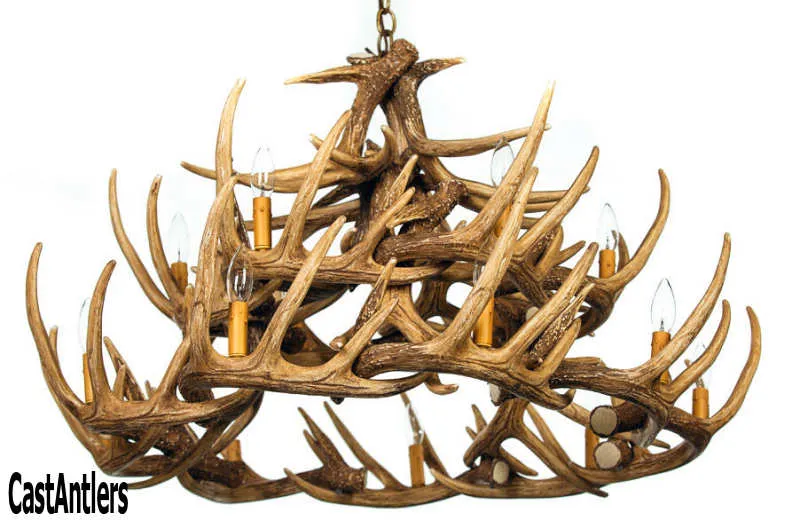 Large, Made in the USA, measures 42" wide and 26" tall, weighs just 16 lbs. Chandelier has 15 candle lights. All wiring is internal. Entire fixture UL listed/approved. Each antler is a professionally handcrafted reproduction. Made from medium-density polyethylene that is light weight but as durable as the real thing, each antler is individually hand-stained and rubbed to look 100% authentic. They require fifteen 25-watt candle bulbs. Chandeliers come standard with 3' of heavy duty chain, multiple colors available. Ceiling plate and mounting hardware included.
