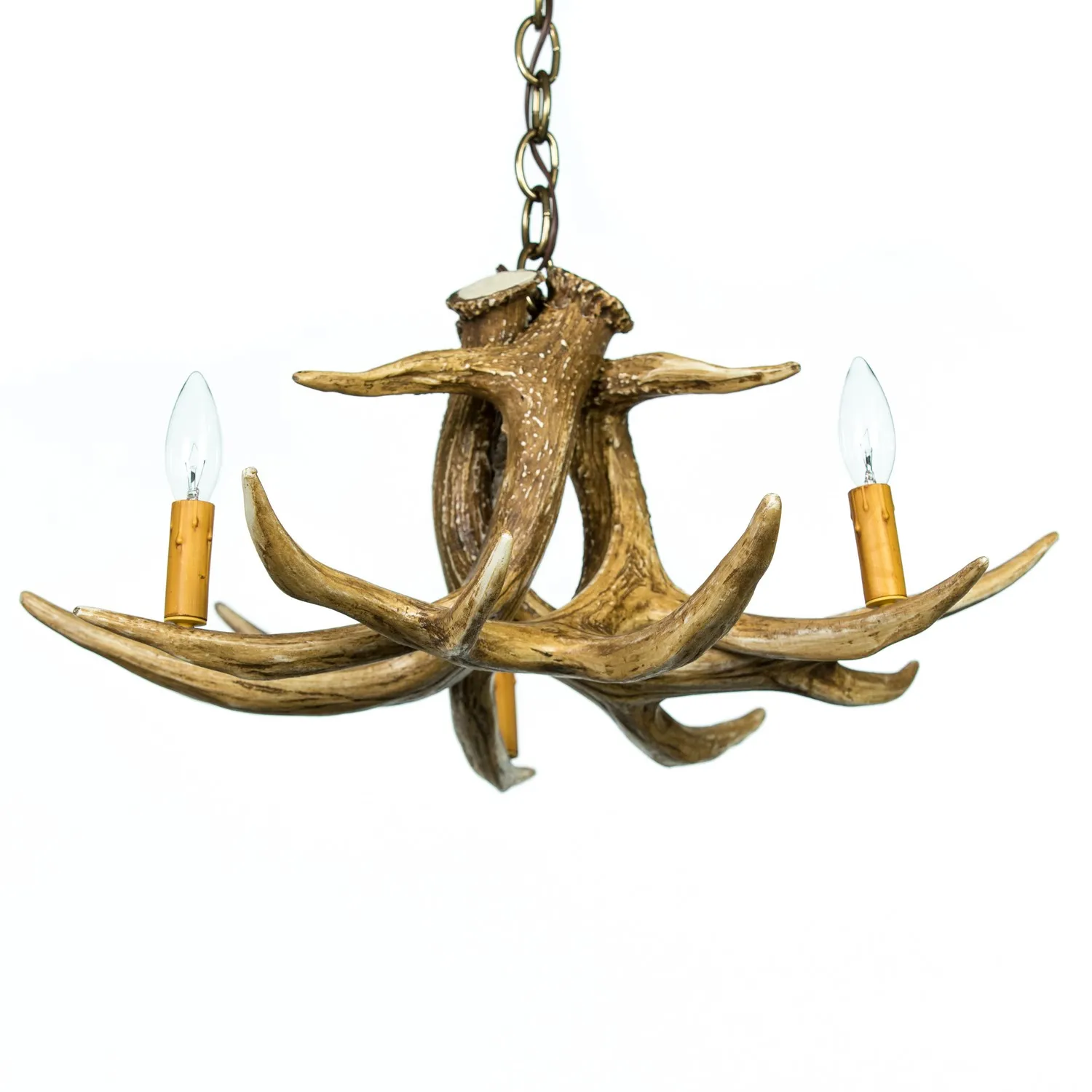This small faux antler chandelier/pendant measures 21" wide and 11" tall, weighs just 4 lbs. Chandelier has 3 candle lights. All wiring is internal. Entire fixture UL listed/approved. Each antler is a professionally handcrafted reproduction. Made from medium-density polyethylene that is light weight but as durable as the real thing, each antler is individually hand-stained and rubbed to look 100% authentic. They require three candle bulbs (Approved for 40-watt candle bulbs). Chandeliers come standard with 3' of heavy duty chain, multiple colors available. Ceiling plate and mounting hardware included.