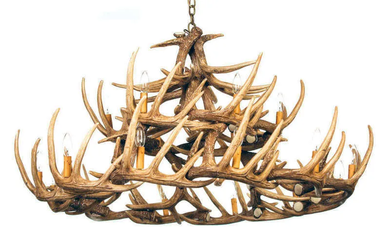 Large, Made in the USA, measures an impressive 50" wide and 27" tall, weighs just 18 lbs. Chandelier has 18 candle lights. All wiring is internal. Entire fixture UL listed/approved. Each antler is a professionally handcrafted reproduction. Made from medium-density polyethylene that is light weight but as durable as the real thing, each antler is individually hand-stained and rubbed to look 100% authentic. They require eighteen 25-watt candle bulbs. Chandeliers come standard with 3' of heavy duty chain, multiple colors available. Ceiling plate and mounting hardware included.